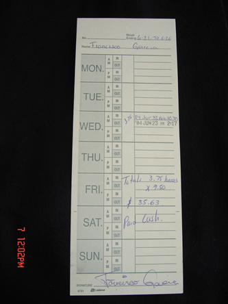 This is the time card of an employee who worked at an apparel cutting service along with 52 other employees.